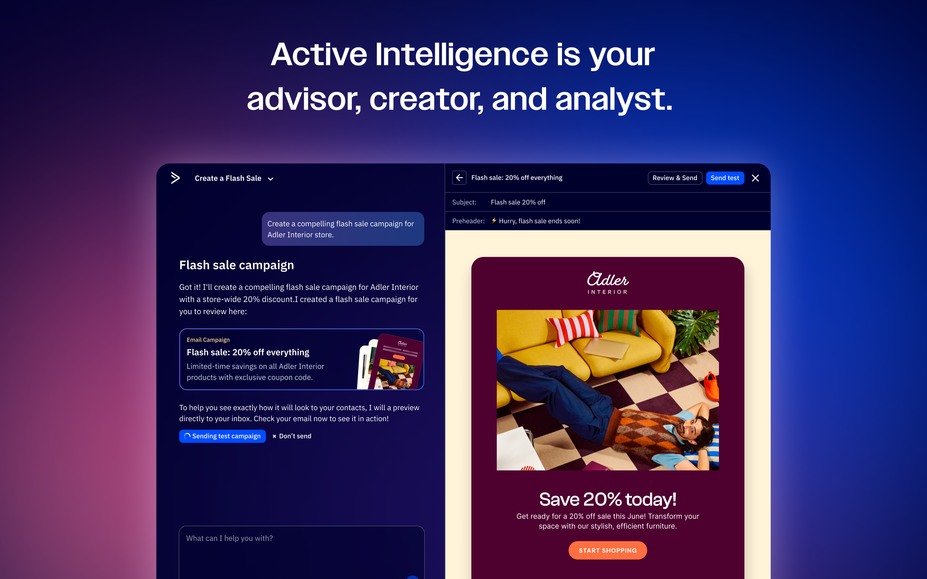 Run entire marketing campaigns through simple prompts, backed by Active Intelligence.