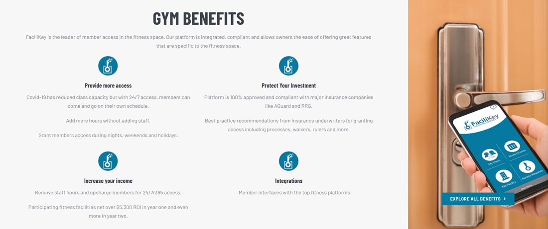FaciliKey is integrated with Mindbody for a compliant, easy to use experience that allows owners to increase revenue by offering unattended access to their facility.